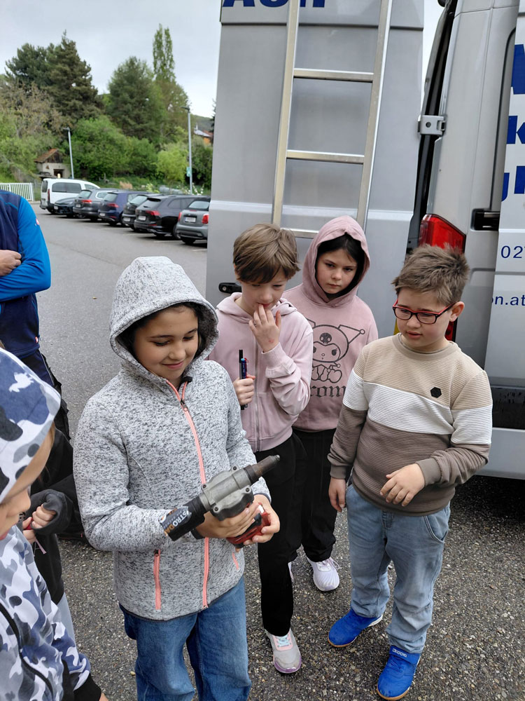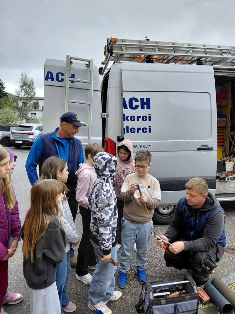 Um den Kindern das Handwerk greifbar zu machen, besuchten Fachleute die Schule. Die Firma EU-Dach präsentierte mit Ernst Uferer und Joels Papa, Julian Müllner, typische Werkzeuge.