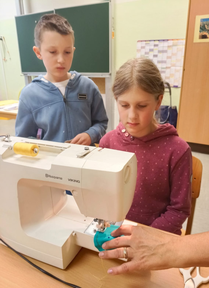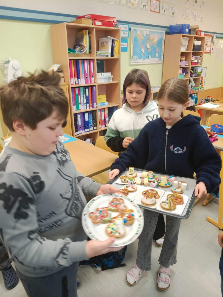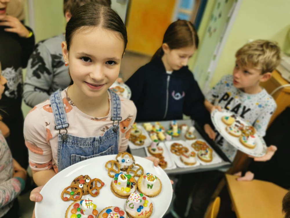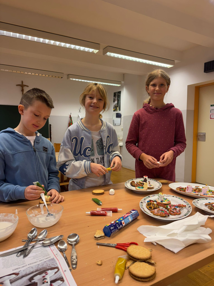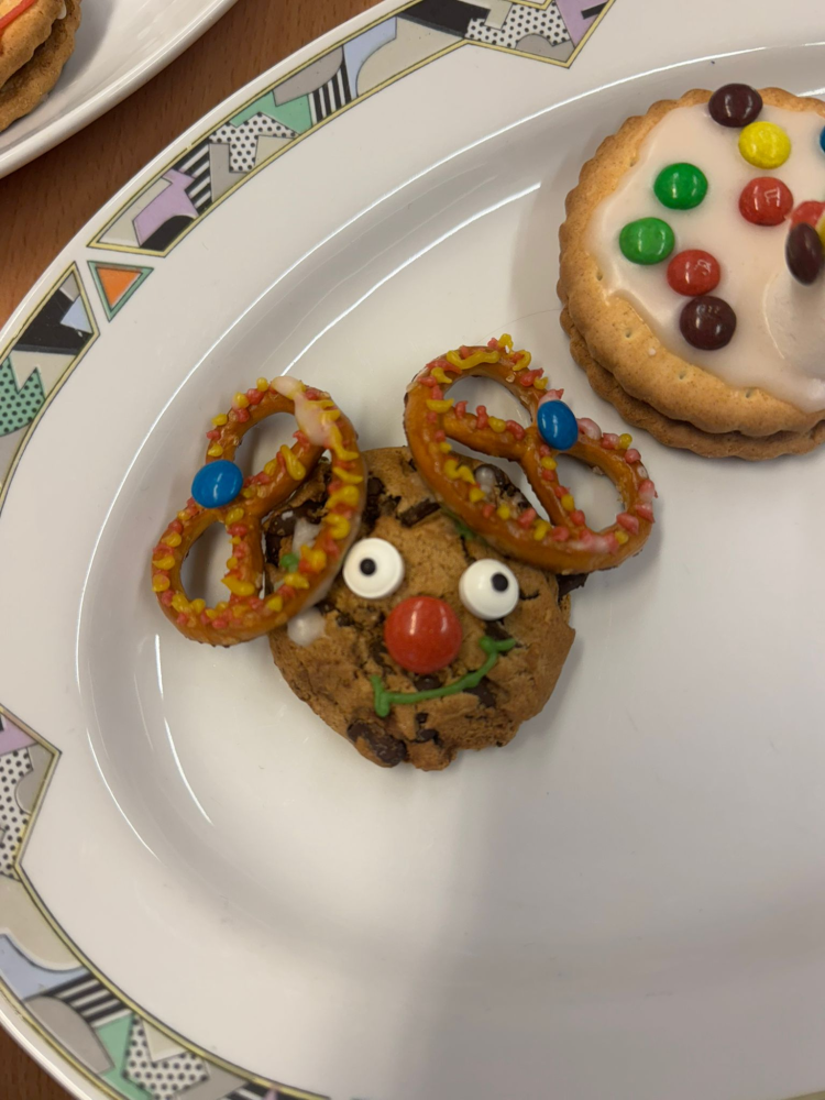 Ein weiteres Highlight waren die Kekse, die zu Rentieren und süßen Kerzen verziert wurden. Frau Pfeiffer unterstützte die Kinder dabei und spendete dankenswerterweise Kekse und Glasuren. Auch an der Nähmaschine durften sich die Schülerinnen und Schüler probieren um Schmuck für den Baum zu gestalten.